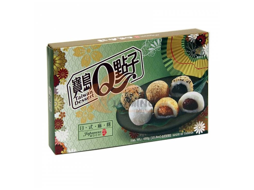 Sestavine: maltoza, lepljivi riž, sladkor, stabilizator (E144), pasta rdečega fižola (rdeči fižol, sladkor, maltoza, palmovo olje), arašidovo maslo ( arašidi , sladkor, palmovo olje, sol, emulgator: E471, aroma arašidov, vanilija v prahu), sezamova pasta ( sezam , sladkor, palmovo olje), pasta zelenega čaja (zeleni čaj v prahu, fižol, sladkor, maltoza, palmovo olje), pasta sladkega krompirja (sladki krompir, fižol, sladkor, maltoza, palmovo olje , arašidi, sezam , zeleni čaj v prahu, naravna barvila (E163, E162), konzervans (E200)
