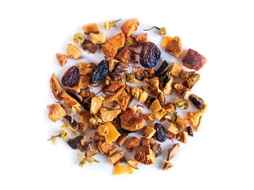 Sestavine: koščki jabolka, grozdje, hruške, borovnica, mandlji, cimet, aroma, rezine pomaranče, listi kamilice